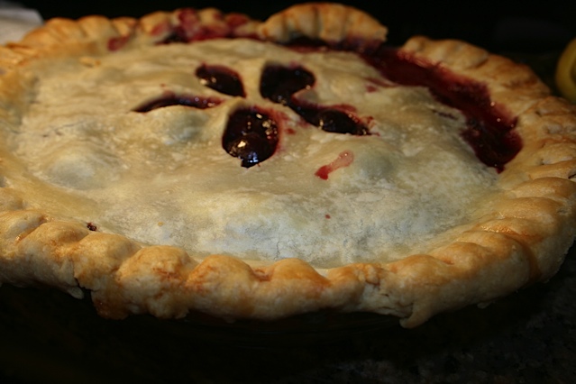 So, Berry pie: another elusive item on my recipe list, along with bread, ice cream (until recently!) and baba ganoush (how do you get it smoky and not bitter??). But I can officially move the Berry Pie onto to the ‘can-do’ list. I guess what prompted the whole thing was making a cherry pie a couple weeks ago for an uncle’s birthday. Special Request! I had never made a cherry pie before and many of the recipes called for sour cherries. However in Spokane at this time there was literally one grocery store that had cherries at all, they were frozen and dark, sweet cherries.