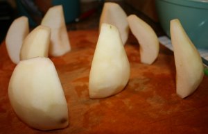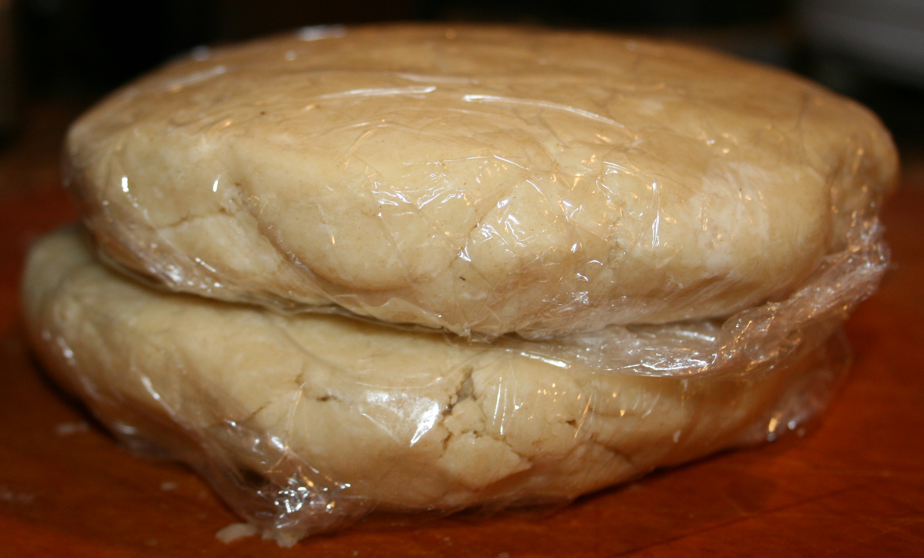 Now place your dough onto a work surface, I just use a cutting board, no additional flour. And in the recipe they go into a whole process of dividing into 8 pieces, etc., etc. I just break it up into a few handful sized pieces and smear them onto the surface. I guess this does something for the fat dispersal. I haven’t tried it without this step, but I just don’t think it’s that important to get too sidetracked into it. You just want to squish things around a bit, scrape ’em up with a pastry scraper or large metal spatula and form them into two disks. These you will cover with plastic wrap and place in the fridge for at least an hour. I think this again harkens back to the fact that you don’t want to butter and shortening to melt before they are in the oven – that’s what gives you your flakes of crust!