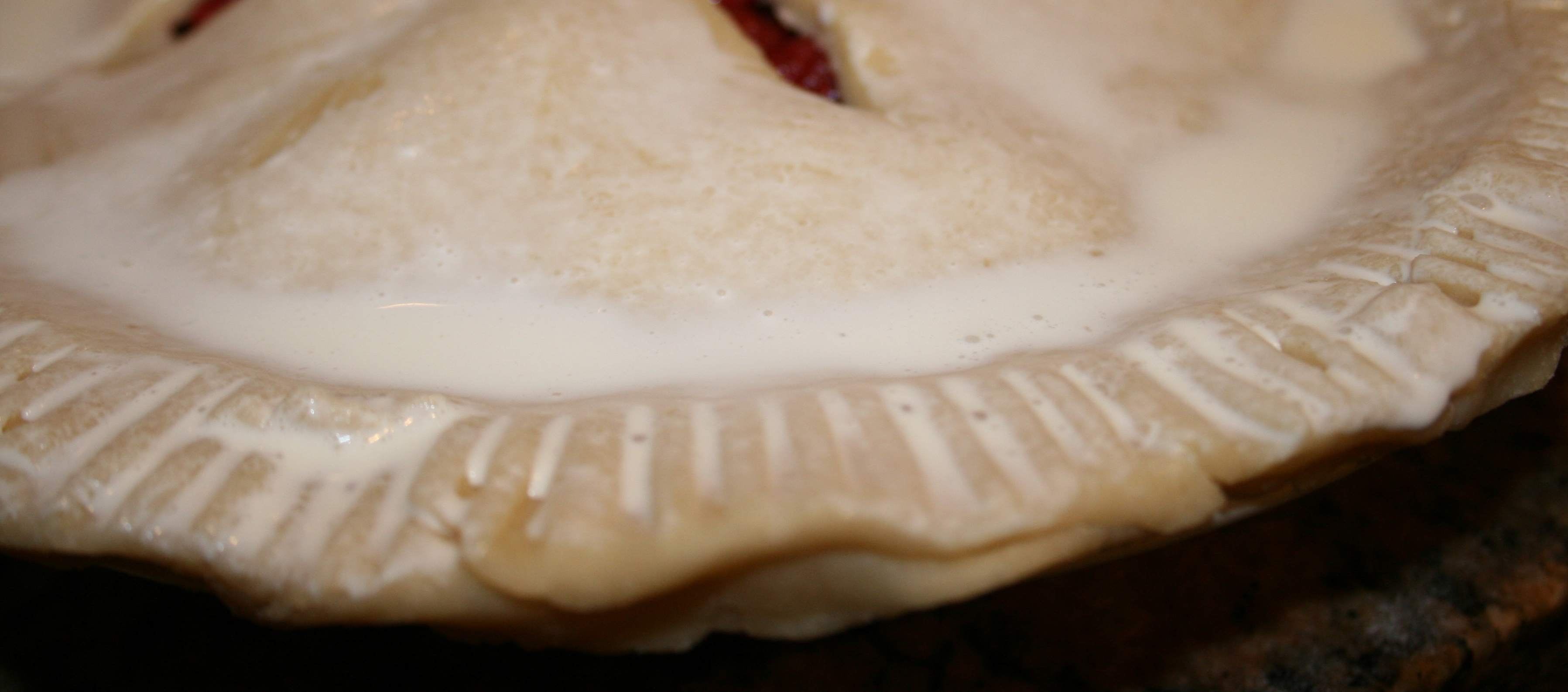 Ok, we are getting down the final moments of this glorious pie bake. Next you’ll want to get the heavy cream and maybe a tablespoon or so of sugar. Brush on the heavy cream, then sprinkle a light dusting of sugar.