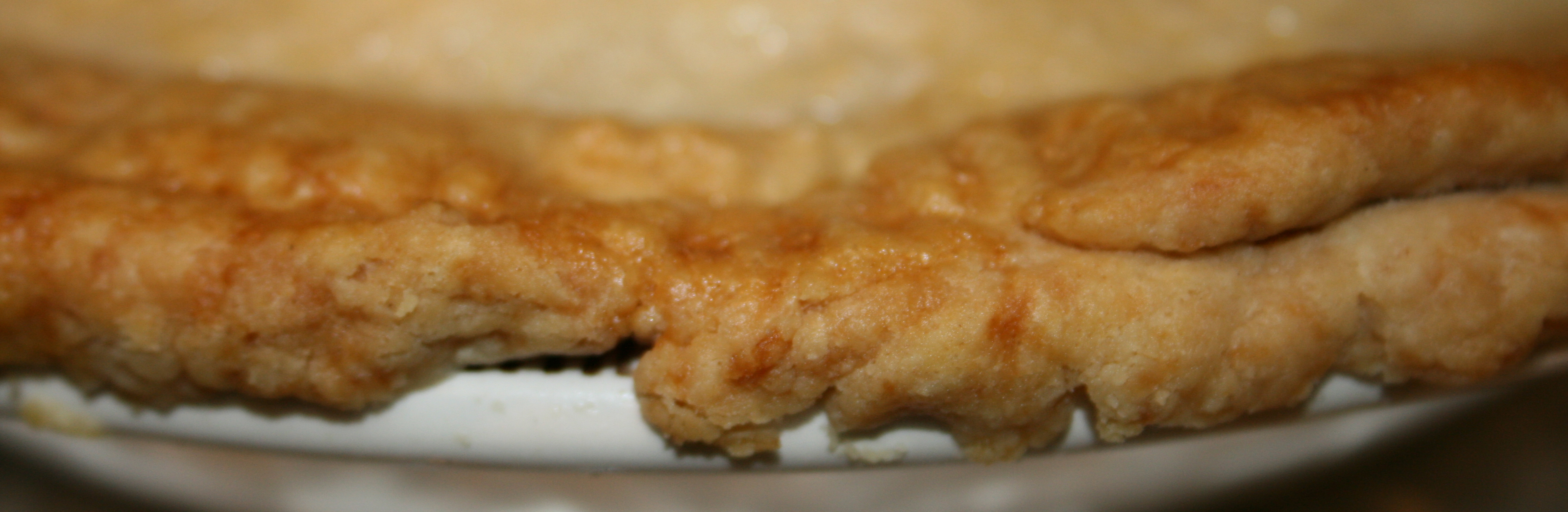 Gently lay your second dough round on top, stretching slightly over the edges. Squeeze the dough that overlaps at the edges together, and generally fold any excess dough under and press together to achieve an even-ish edge. Some people would tell you to cut it off perfectly about an inch over the edge and roll under. Not me. I tell you that I wouldn’t give away those extra bits of brown crusty dough for the world.
