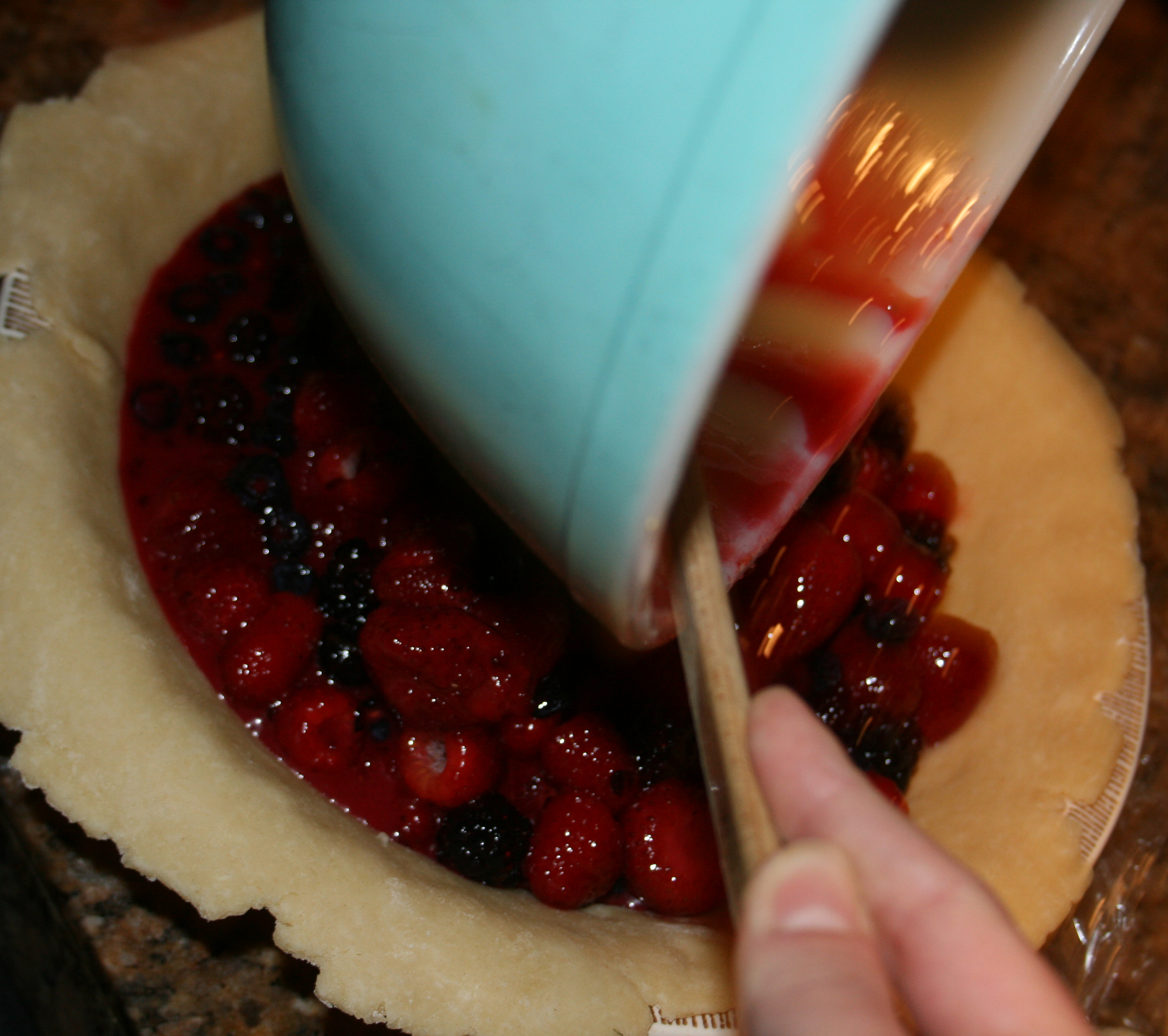 The Red Sea of Cherry! Although the recipe called for both cornstarch and tapioca, I don’t think there was nearly enough of either. But more importantly, it did not recommend that you thaw the berries first. I think whenever making a pie with frozen fruit it is very important to drain out the extra water being retained in the fruits, otherwise there will be too much liquid to deal with!