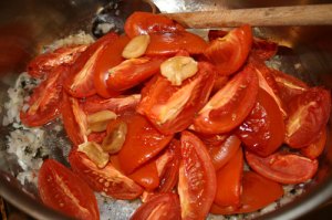 After a few minutes, the shallots should be softened and fragrant. Now it’s time to add the tomatoes!