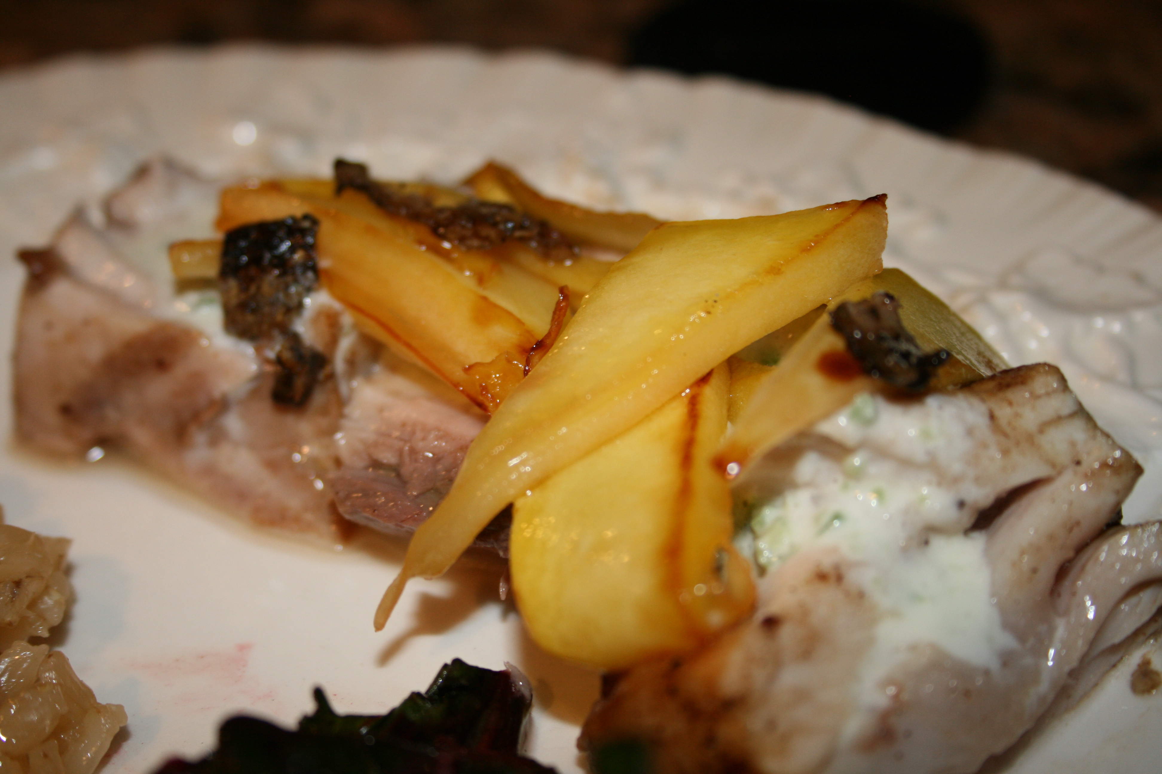 Additional note: We found that the drizzle is more than you really need for the soup – so my husband had the inspiration to use it on some sauteed mahi – mahi. We also lightly caramelized some mango in a stainless steel pan to add a little sweetness to the fish. It turned out deliciously! And who doesn’t like using everything? I’m sure there’s lots of other things to do with the drizzle – if you do something interesting with it, send us a picture! Here is our fish: