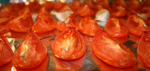 First, quarter the plum tomatoes lengthwise. Then prepare some baking sheets by covering them with foil. If your pan doesn’t have an edge – you might want to create one with the foil. I haven’t had a problem with this yet, but if your tomatoes are extra juicy, it could run over the edge – and believe me, my oven doesn’t need any help getting messy!