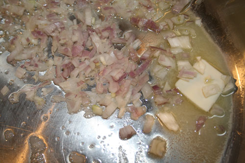 Put a large saucepan or soup pot on the stove and warm over medium-low heat. Toss in 1 tablespoon of unsalted butter and the shallots. Toss in the 1/2 teaspoon of dried oregano. The recipe from epicurious also tells you to add the salt and pepper here, though I’m not totally sure why. The salt could help the shallots release some moisture, but I do most of my salt and peppering to taste at the end of the process. Your choice!