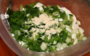 I’m not sure where this idea came from. It was one of those things where you just start DOING something, chopping the onions, sprinkling the garlic powder in, and a second later you wake up, and sitting before you is something that could be really good …or really bad. In this case, it turned out pretty well, although I should warn that if you don’t like an onion-y flavor, then you may want to use half the bundle instead of the whole thing. I went a little green onion crazy.