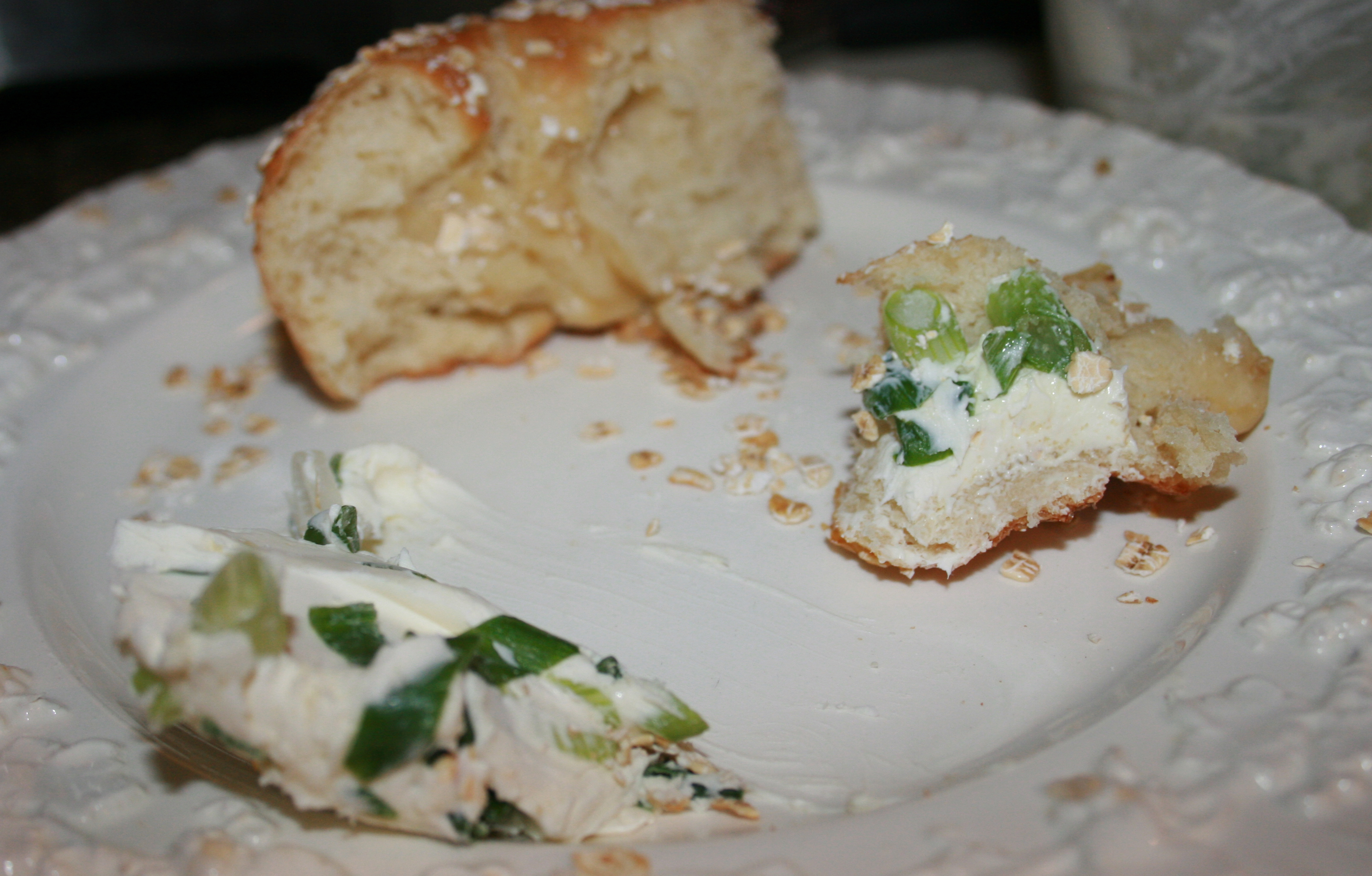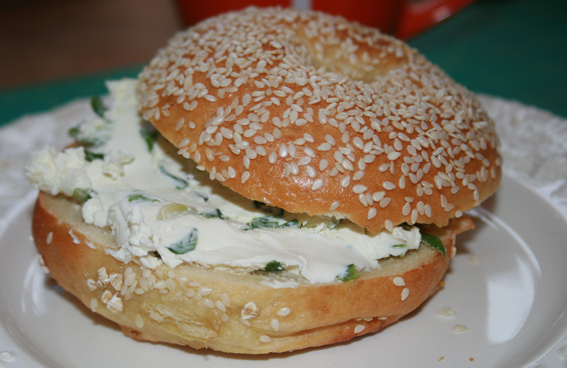 So, now you’re dough is rising. And you’re thinking: what delicious spreads will I alight upon my delicate and scrumptious bagel? My answer? Green Onion and Garlic cream cheese.