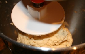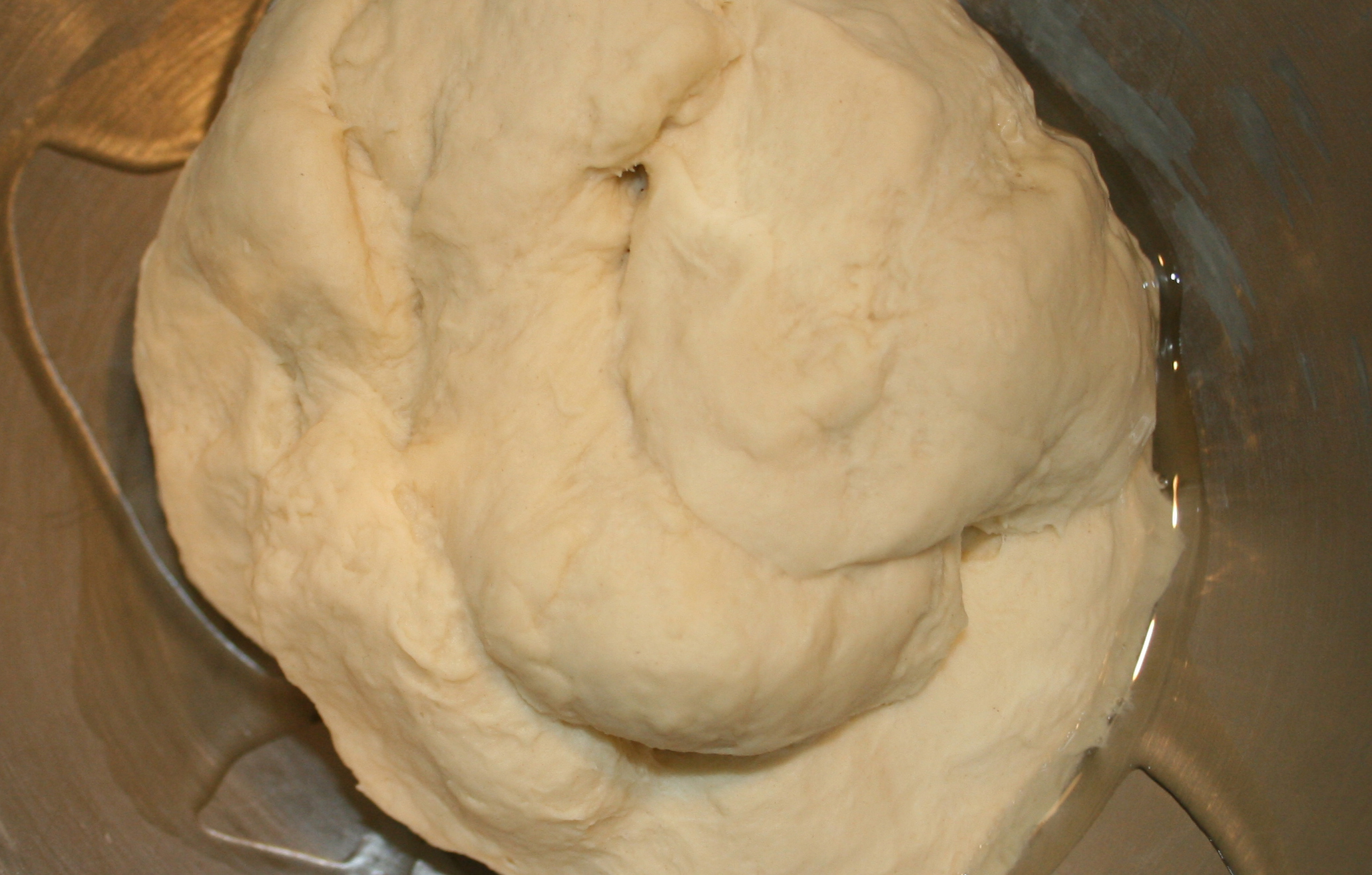 Next, you’ll want to prep another mixing bowl by greasing its sides with oil. I used sunflower oil, but vegetable oil would work too. Olive oil might be interesting to try as it may impart a little more of its flavor than the others. In any case, once the dough has come together in a ball I detach my bowl from the mixer. Then I sprinkle a little oil around it’s circumference.