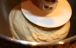 Plop that baby into your oiled mixing bowl and cover in plastic wrap until it has doubled in size. For the original recipe the time was estimated at fifteen minutes. However, in OUR kitchen, which is sort of like the arctic tundra, it takes a little more like twenty minutes to half an hour. Just look for the doubling. Sometimes I use the oven turned to 200 degrees to give everyone a boost, including me!