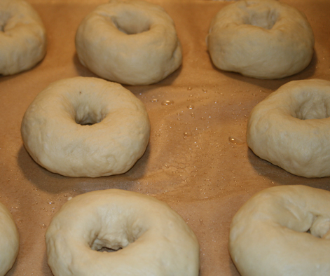 Here is another revision to the bagel shaping called for in the original recipe, via my mom. Roll each piece of dough into a ball and then flatten slightly into a small, even disc.
