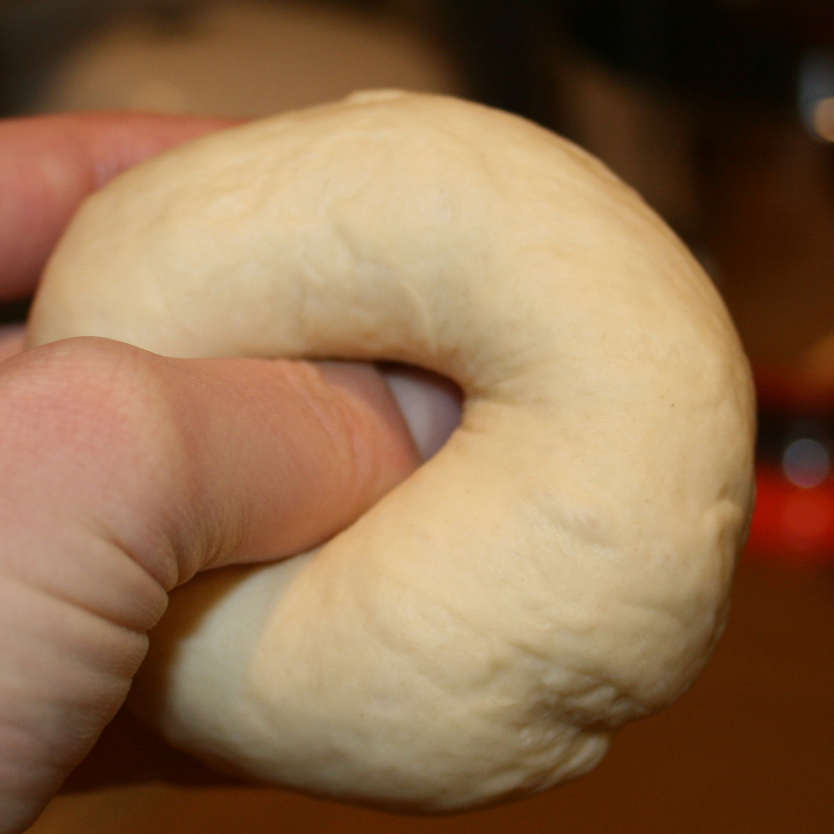 You will have to do a little ripping through the dough, and a little squishing around to seal the edges. I also found that swinging the dough around my two first fingers, like a mini pizza dough tosser, helped even out the seam. While it does not a perfect bagel make, I find it to be a lot less hassle than rolling each dough ball into an even strip and then squishing the ends together. But to each his own, if you are a roll-squisher, by all means, be my guest!