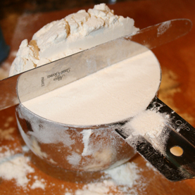 For those of us with scales, it’s back to the drawing books! Get your bowl positioned, “zero out,” and lay your dough inside. If I recall correctly mine weighed around 1080 grams, so divided by 10 pieces, each should weigh 108 grams. I know, I know, I’m SUCH a math whiz.