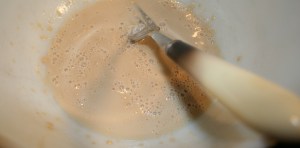 Give the liquid another couple swirls with the fork to make sure all the yeast bits are dissolving.