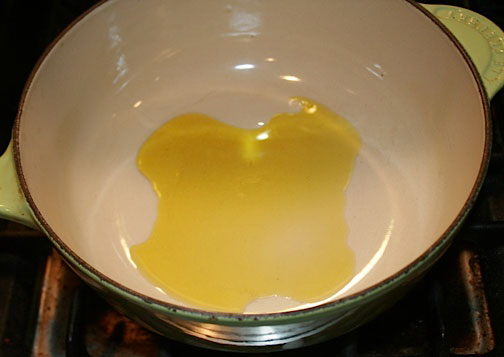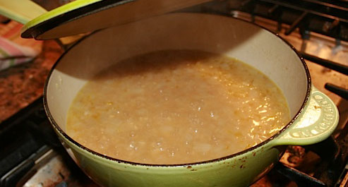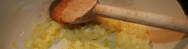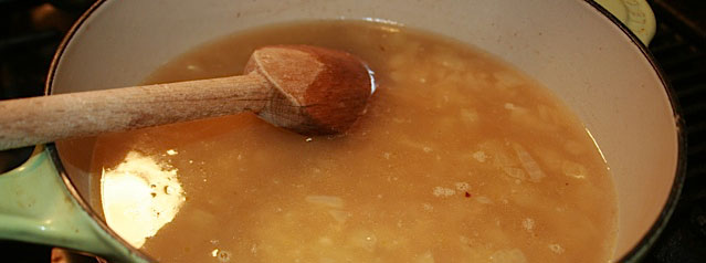Heat up some olive oil in a pot – if you have a ceramic one all the better for browning the onion, but metal works too! Non-stick won’t really get you there. You’ll have transparent onion bits, but maybe not as browned. You may also have to add a bit more olive oil if the onions start to look a little dry. Just keep an eye and trust your instincts!